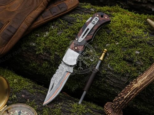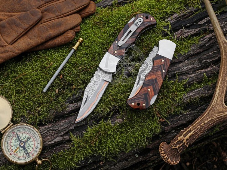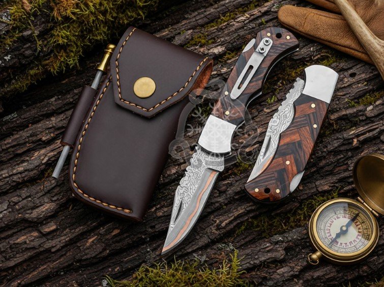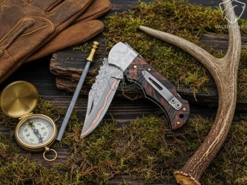 1× Copper Damascus Folding Knife (Rose Wood Handle)
