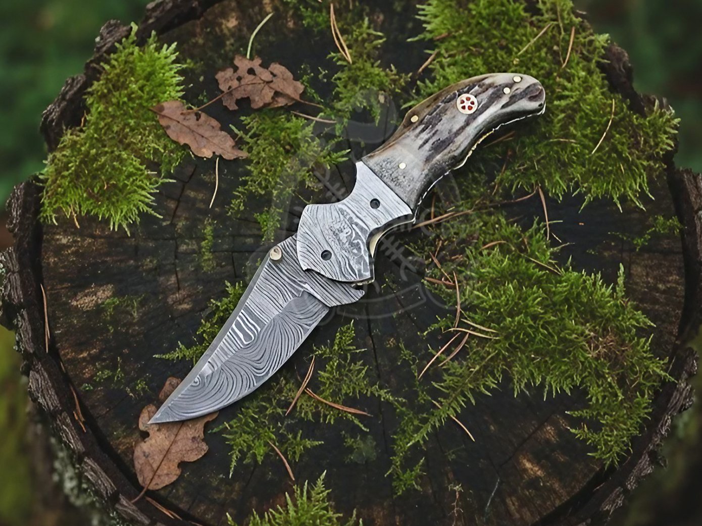 Handmade Damascus Steel Folding Pocket Knife with Stag Horn Handle – Great Gift for Men, Groomsmen, Birthdays, Weddings, or Anniversaries