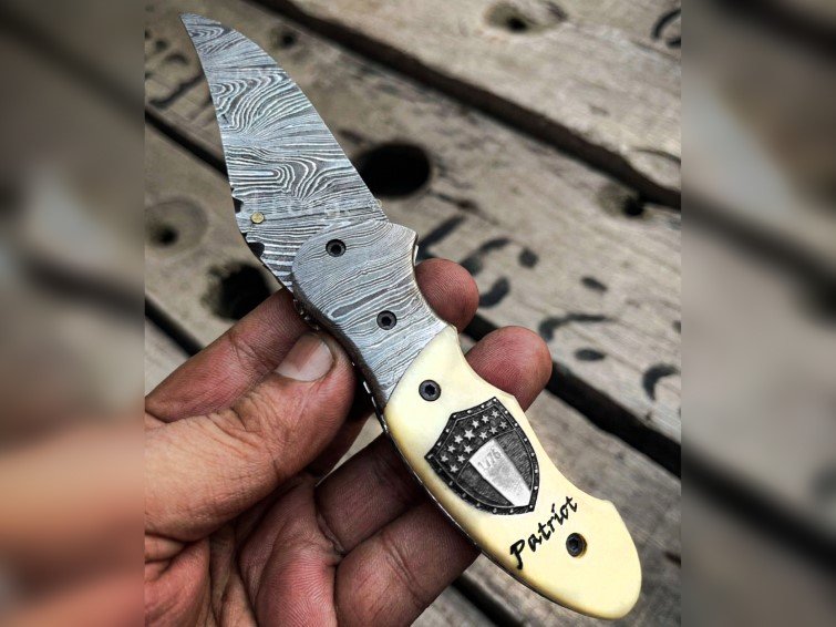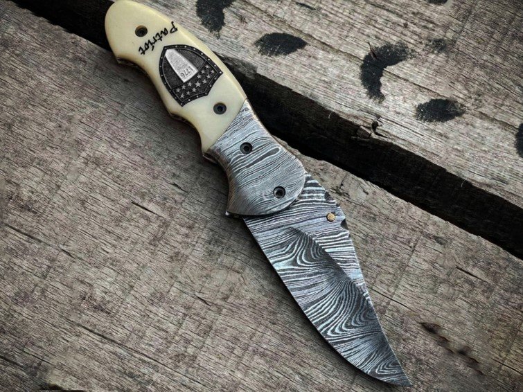 Damascus Handmade Folding Knife With Bone Handle & American 1776 Badge | Comes with Gifted Wooden Box