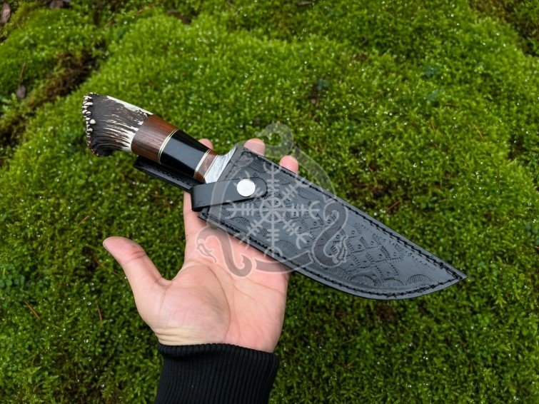 This exquisite hand-forged Damascus steel knife features a robust 7-inch blade crafted from layered high-carbon Damascus steel, renowned for its sharpness, durability, and striking patterned finish. The full tang construction ensures exceptional strength and balance, making this knife a reliable companion for outdoor adventures, hunting, or collection.