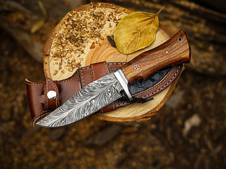RK-1067 Handmade Hunting Knife | Damascus Feather Blade | Rosewood Handle with Leather Sheath | Outdoor Gift