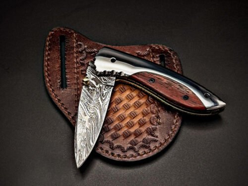 RK-1111 Handmade Damascus Folding Knife | Wood & Steel Handle | Leather Sheath | Camping & Hunting Gift for Him