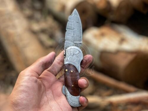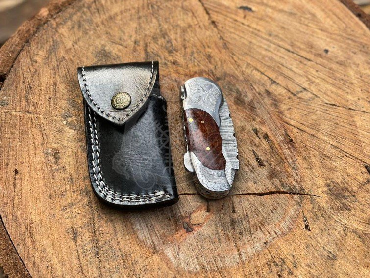 RK-1041 Handmade Damascus Folding Pocket Knife | Wood Handle | EDC Hunting & Camping Knife | Leather Sheath Included