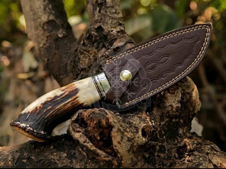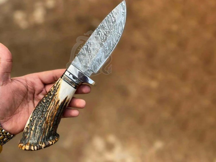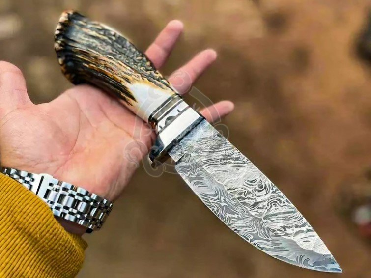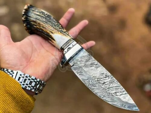 The blade is hand-forged from high-quality Damascus steel, providing exceptional sharpness, edge retention, and a striking pattern unique to each knife. The handle is crafted from premium deer stag antler horn, offering a natural, ergonomic grip for comfortable handling during hunting, camping, or outdoor tasks.