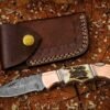 RK-1087 Handmade Damascus Steel Folding Knife | Stag & Copper Bolster Handle | Premium Knife with Leather Sheath