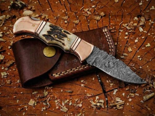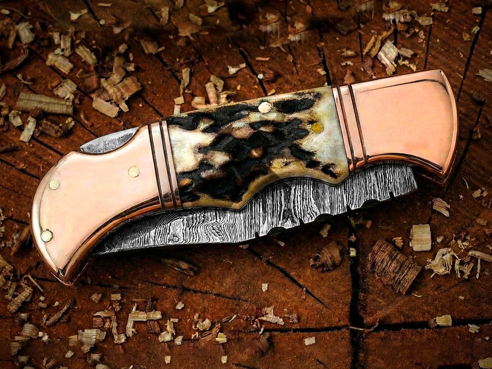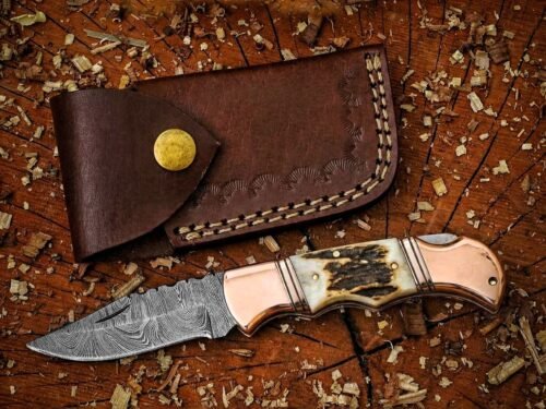 The handle features genuine stag horn paired with polished copper bolsters, offering a secure, ergonomic grip and a timeless, rustic luxury look. Whether used for camping, hunting, hiking, fishing, or everyday carry (EDC), this folding knife delivers reliable performance and refined style.