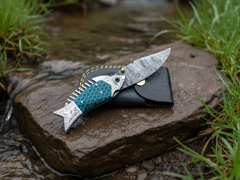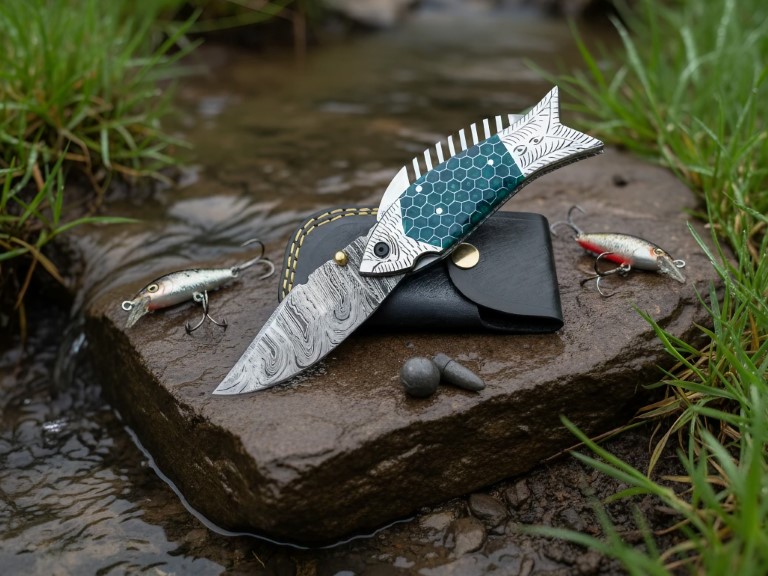 Introducing the Handmade Damascus Steel Pocket Knife, Fishing Folding Knife, Camping Knife, Halloween Gift, Groomsmen Gift for Him, Personalized Gift — a perfect blend of craftsmanship, performance, and style. Hand-forged from premium Damascus steel and designed with a unique fish-inspired handle, this folding knife is built for outdoorsmen, collectors, and gift-givers alike.