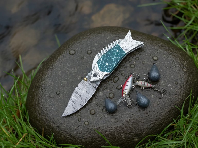 The fish-inspired handle paired with a twist Damascus blade ensures no two knives are ever alike.