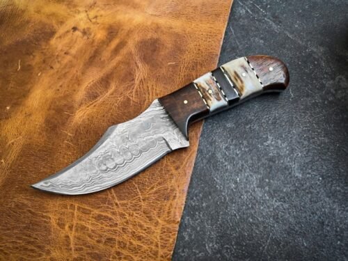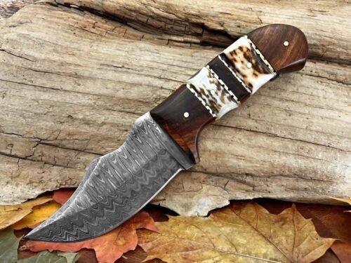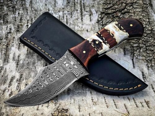 Be the first to review “RK-1102 Handmade Damascus Steel Skinner Knife| Rose Wood and Stag Handle with Brase Spacers | Premium Damascus Knife with Leather Sheath Personalized Gift ,Gift For Him & Her”