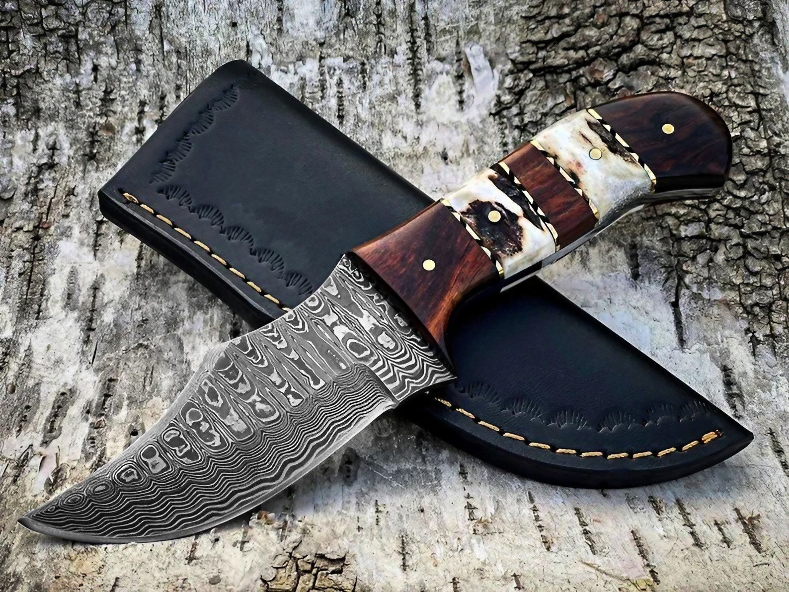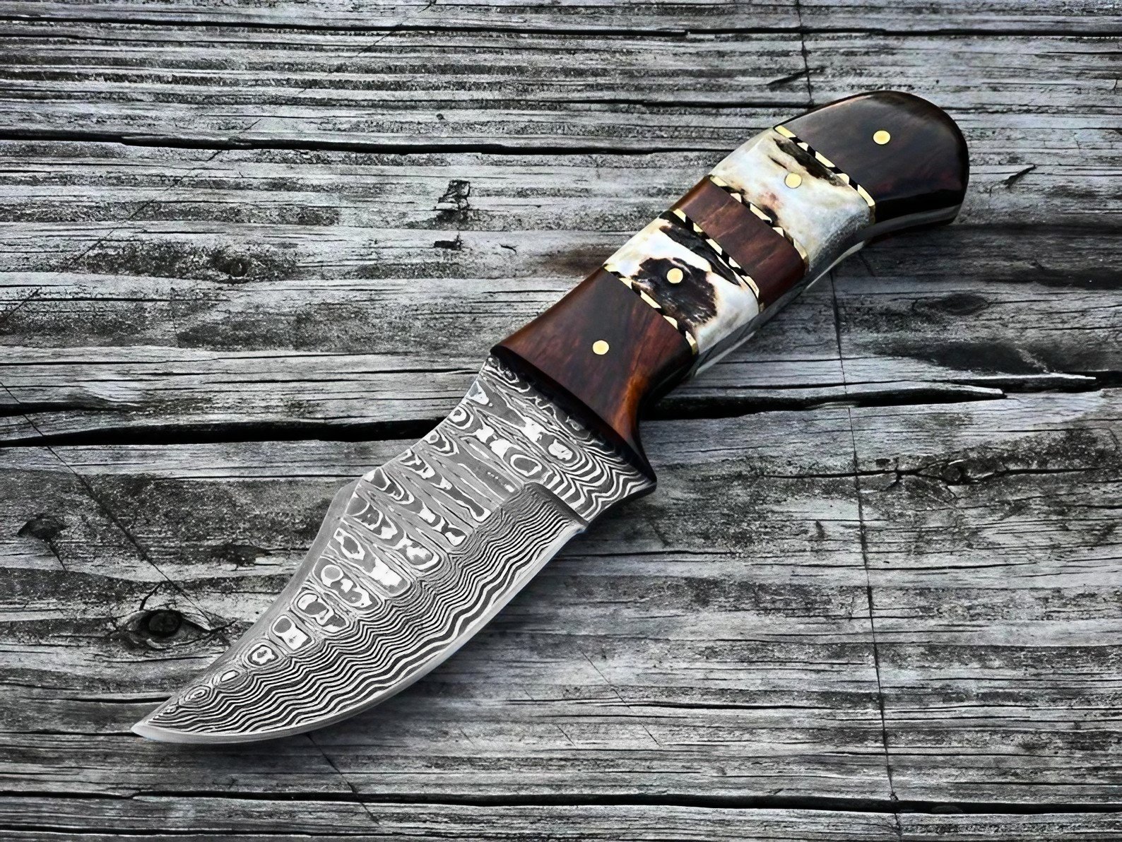 Elevate your collection with the RK-1102 Handmade Damascus Steel Skinner Knife, a perfect blend of craftsmanship, durability, and elegance. Crafted from premium hand-forged Damascus steel, this knife offers unmatched sharpness, resilience, and a distinctive wavy pattern that makes each blade truly unique. The handle combines rosewood and stag with brass spacers, ensuring a comfortable grip and timeless aesthetic. Every knife comes with a genuine leather sheath, making it safe, stylish, and ready for display or use.