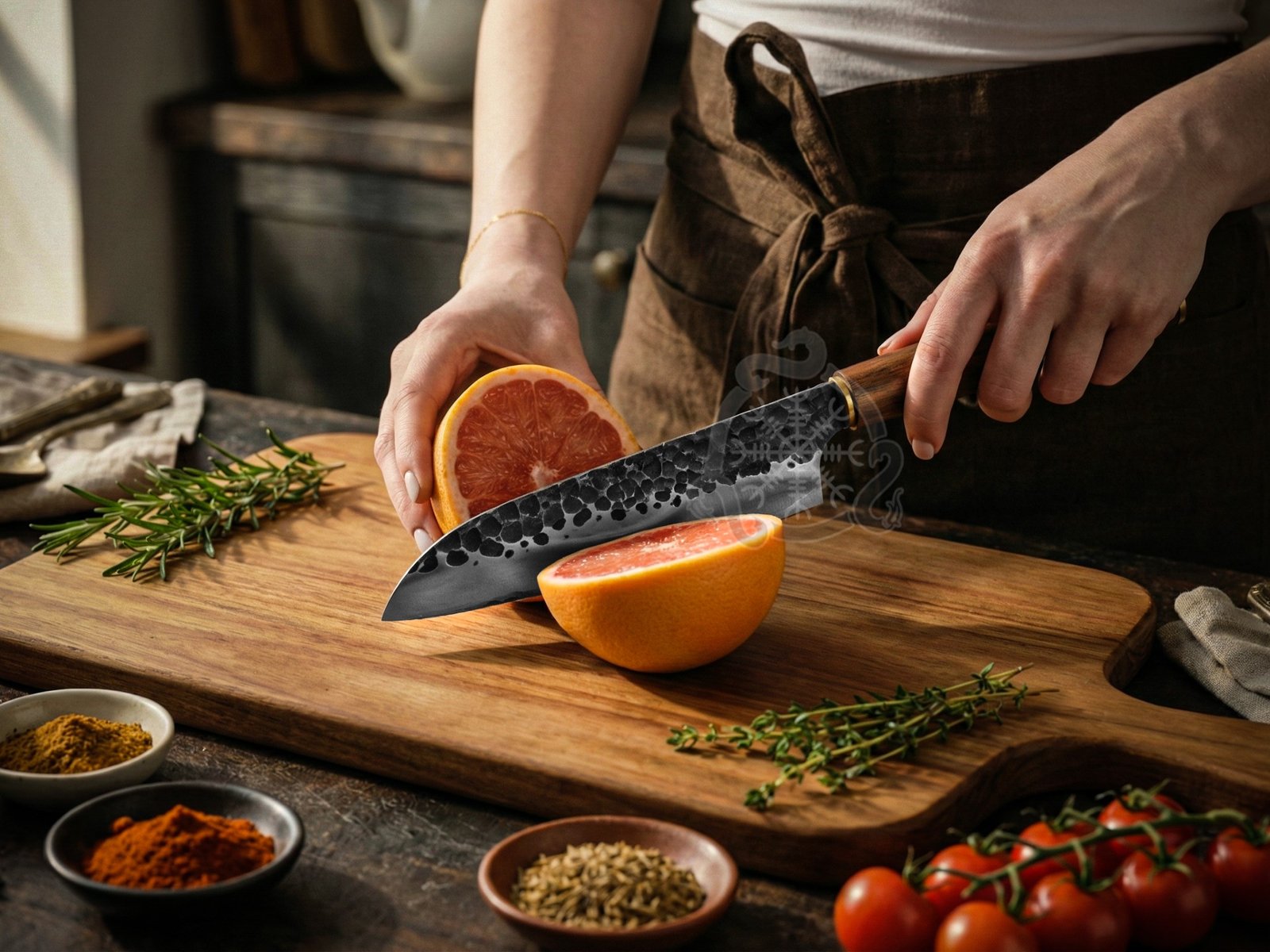Featuring a razor-sharp hand-forged steel blade, this knife delivers exceptional edge retention, superior cutting performance, and long-lasting reliability. The elegant rosewood handle with brass spacers ensures a comfortable, balanced grip while adding a touch of classic sophistication. Paired with a high-quality leather sheath, this chef knife is both functional and gift-ready.