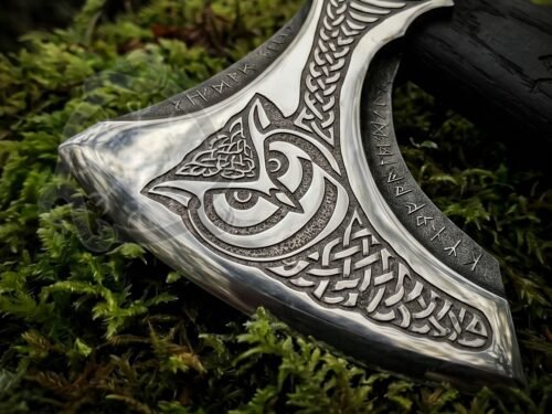 Unleash true Norse craftsmanship with the RK-1115 Handmade Steel Viking Owl Axe, a striking blend of artistry and power. Expertly handcrafted from durable steel, this unique battle axe features an eye-catching owl-inspired blade design with intricate detailing that reflects Viking heritage. The beautifully engraved wooden handle, paired with leather-wrapped accents, offers both comfort and an authentic rustic look. Perfect for collectors, historical enthusiasts, cosplay, gifting, or display, this personalized Viking axe stands out as a bold symbol of strength and tradition. Designed for those who appreciate handmade quality and legendary style.