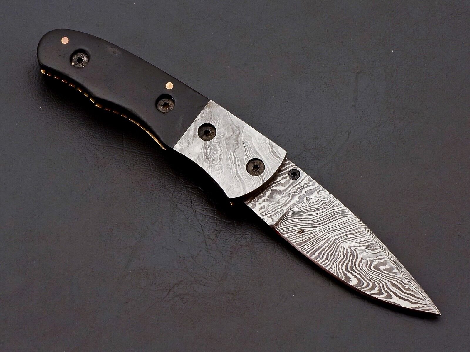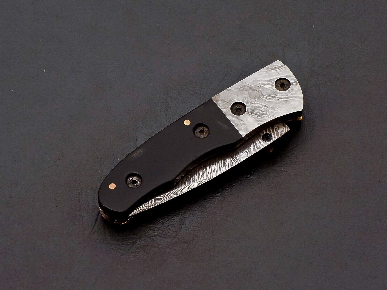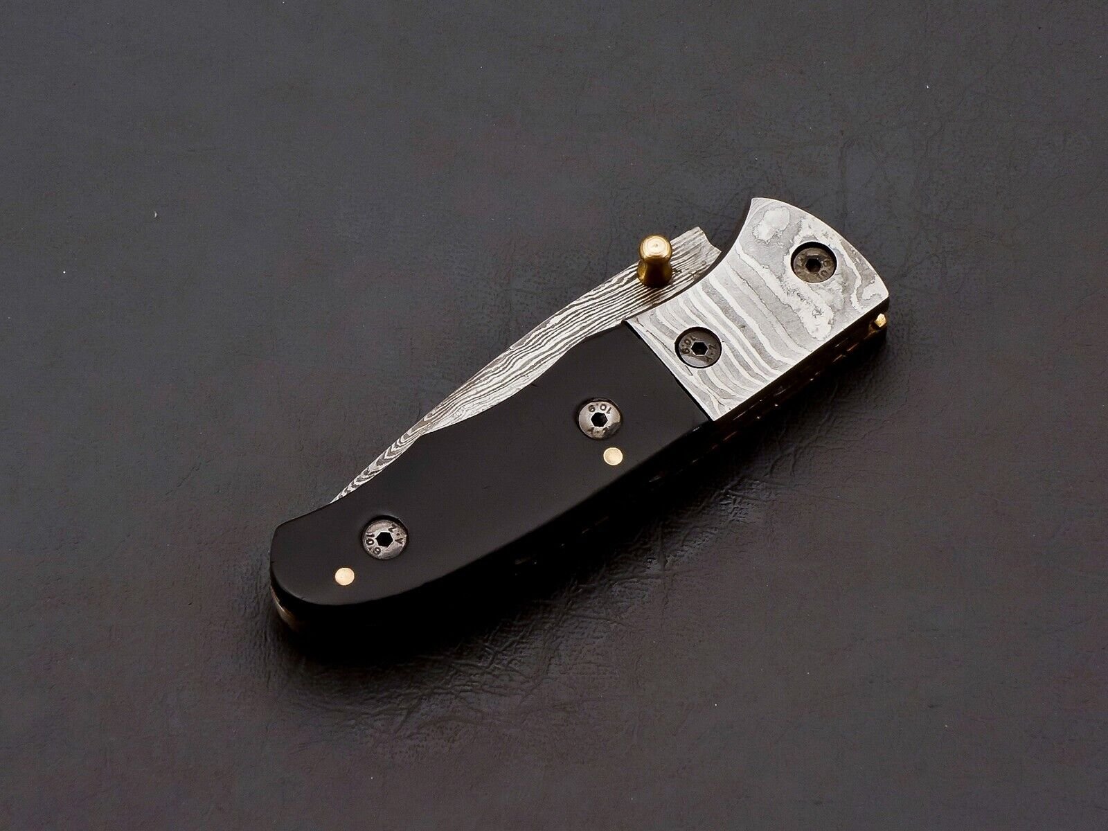 RK-443 Liner Lock Damascus Pocket knife Damascus Bolster Bull Horn Hand Forged knife Every Day Carry Knife Damascus Knives USA Made Gift For Him Gift For Her