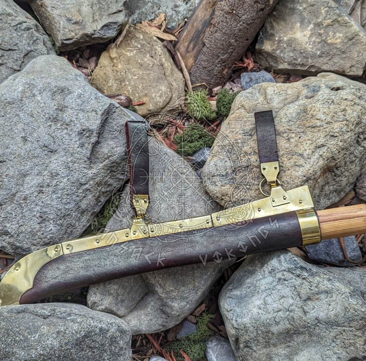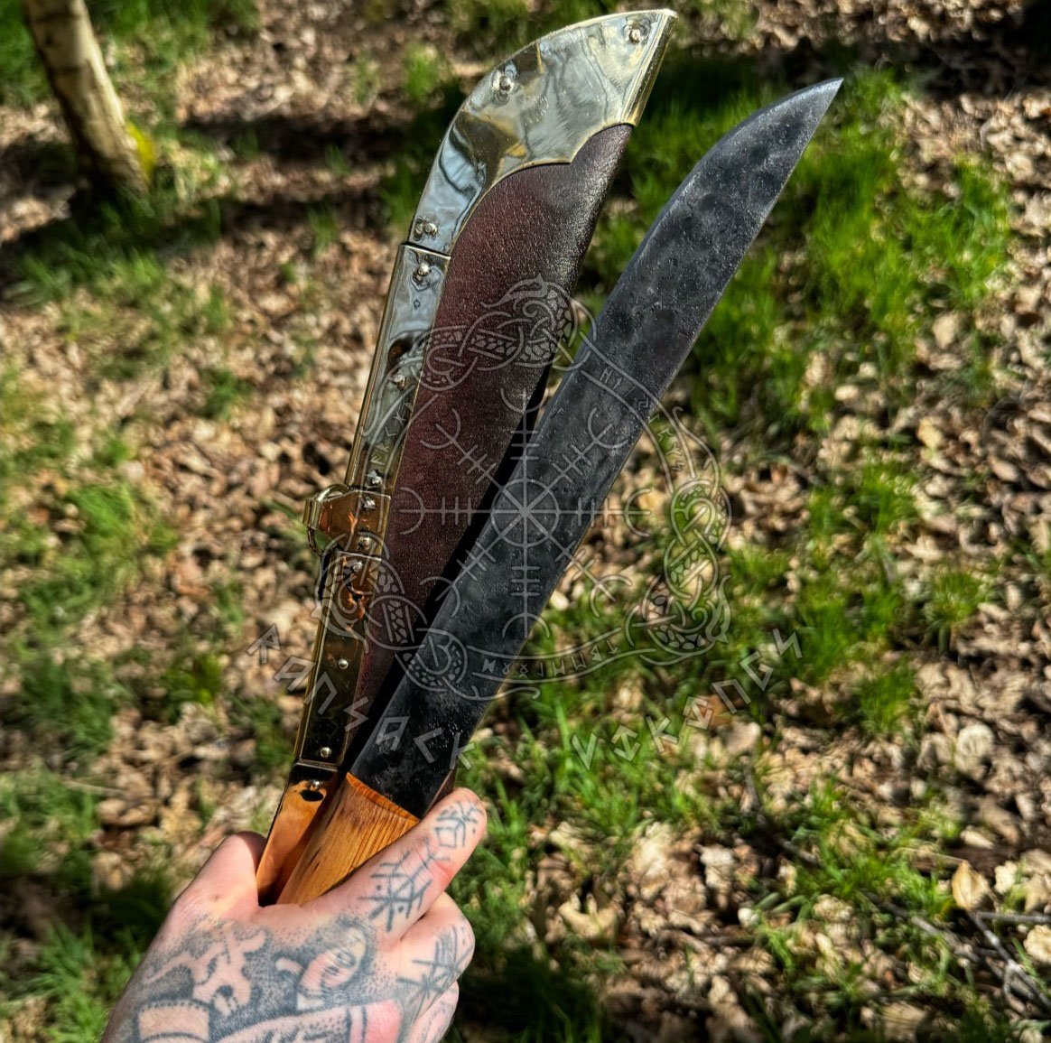 Our Viking Seax showcases exceptional craftsmanship, crafted from premium materials. The blade is meticulously hand-forged from carbon steel, achieving the iconic straight-back shape typical of Viking seaxes. The handle is skillfully fashioned from olive wood and adorned with a brass cap. We’ve finished the entire seax with our unique beeswax and linseed oil blend, which not only protects the blade but also enhances grip and highlights the natural beauty of the wood grain. The scabbard is hand-sewn and beautifully finished with brass accents.