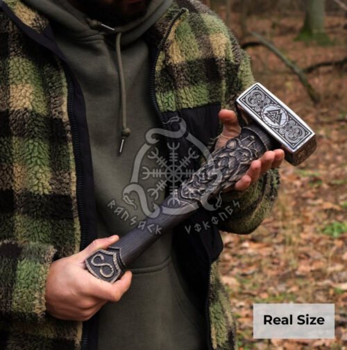 The hammerhead is intricately etched with the sacred symbol of Odin, the Allfather, embodying wisdom, warfare, and the poetic heart of the Viking soul. The handle, hewn from resilient ashwood, bears a carved likeness of Odin himself, a tribute to the god’s enduring influence over all who wield this mighty tool.