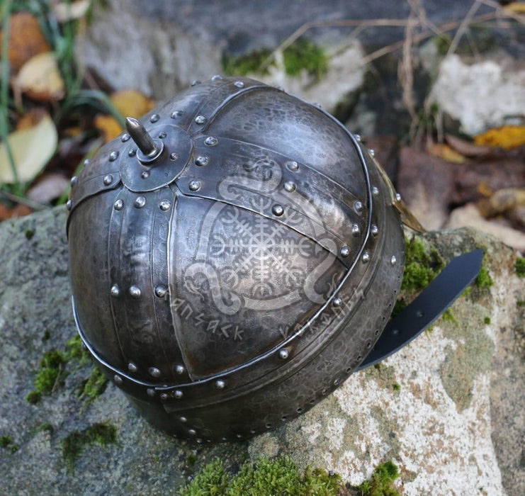 Inspired by the classic helmets worn by Viking warriors between the 8th and 11th centuries, this helmet captures the essence of Scandinavian craftsmanship. The design features traditional elements such as the rounded dome, often associated with the protection used in Viking combat. The helmet’s authentic appearance is enhanced by its robust construction, ensuring that it is not only a display piece but also a functional piece of armor.
