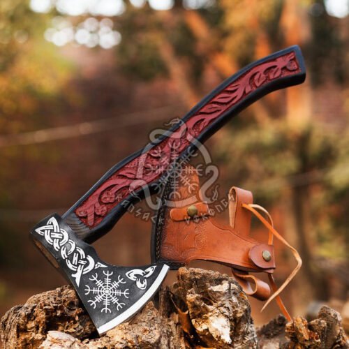 Our axes can be customized to your demanding needs with elaborate wood carvings and personalized etching like family crests or any symbol you desire. Our process to create your custom design can be long due to our demanding quality standards that will bring you a product you will be happy with forever and create others for your family, or workshop. Each axe is accompanied by a natural leather sheath hand made to fit each axe shape.