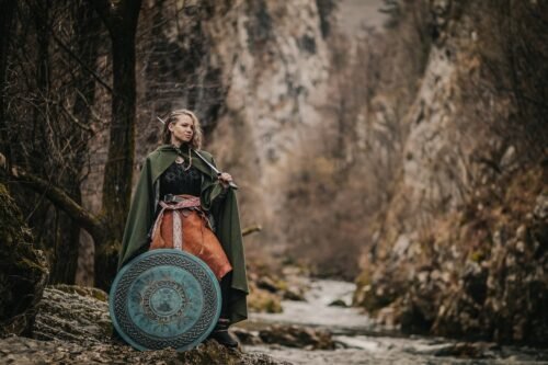 Embrace the mystique of Norse mythology with this stunning Viking shield, meticulously crafted to honor the ancient legends. Measuring 24 inches in diameter, this shield features intricate carvings of Odin’s ravens, Huginn and Muninn, symbols that embody wisdom and memory in Viking lore.