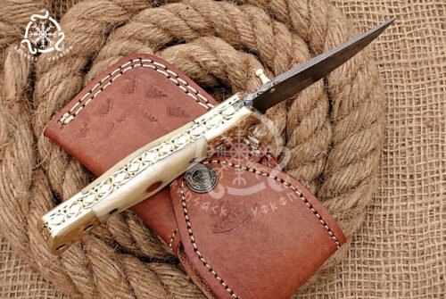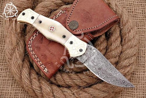 Introducing the Ransack Viking Hand-Forged Damascus Steel Bone Handle Folding Pocket Knife, a high-end choice for collectors, outdoor adventurers, and anyone who values superior craftsmanship and rugged elegance. This folding knife is designed to combine strength, beauty, and functionality, making it an essential addition to any knife collection.