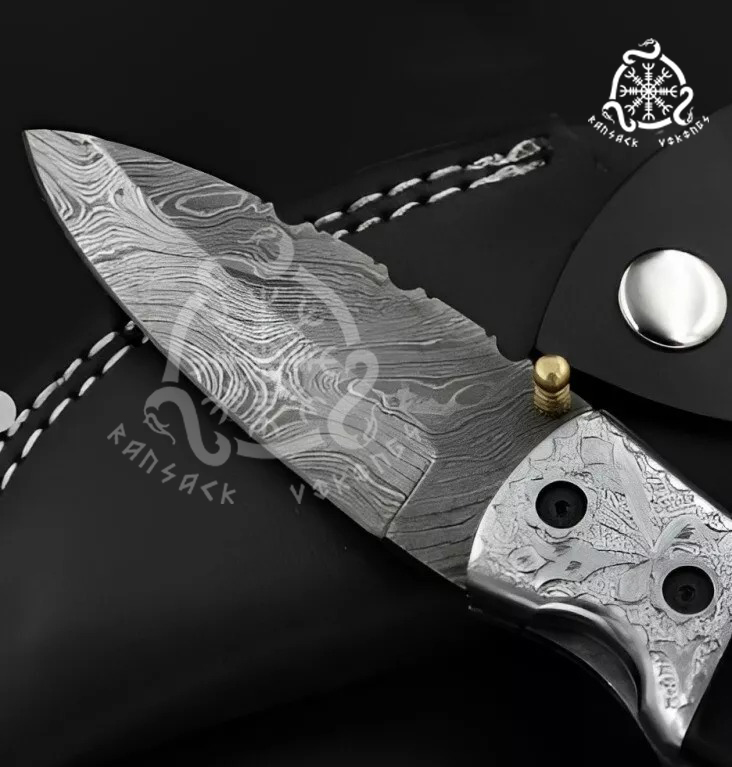The Ransack Viking Hand-Forged Damascus Steel Folding Pocket Knife is a stunning blend of craftsmanship, durability, and elegance, perfect for those who appreciate fine details and reliable performance. With an overall length of 10 inches, this knife features a 5-inch Damascus steel blade paired with a resin handle and an engraved brass bolster, making it an outstanding choice for a gift.