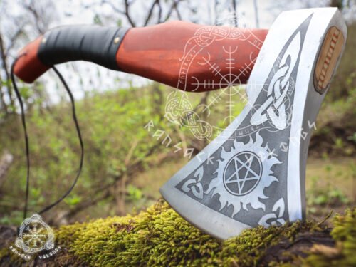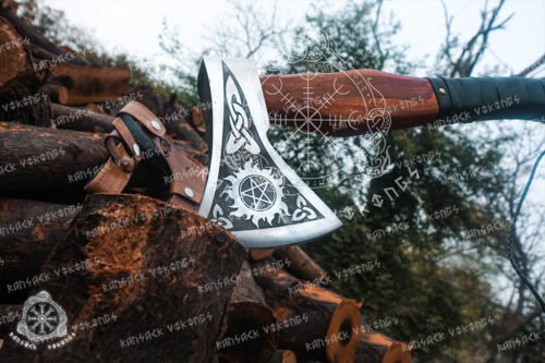 Our axes can be customized to your demanding needs with elaborate wood carvings and personalized etching like family crests or any symbol you desire. Our process to create your custom design can be long due to our demanding quality standards that will bring you a product you will be happy with forever and create others for your family, or workshop. Each axe is accompanied by a natural leather sheath hand made to fit each axe shape.