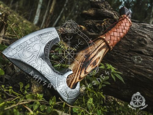 Our axes can be customized to your demanding needs with elaborate wood carvings and personalized etching like family crests or any symbol you desire. Our process to create your custom design can be long due to our demanding quality standards that will bring you a product you will be happy with forever and create others for your family, or workshop. Each axe is accompanied by a natural leather sheath hand made to fit each axe shape.