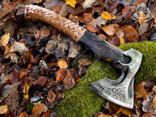 Our axes can be customized to your demanding needs with elaborate wood carvings and personalized etching like family crests or any symbol you desire. Our process to create your custom design can be long due to our demanding quality standards that will bring you a product you will be happy with forever and create others for your family, or workshop. Each axe is accompanied by a natural leather sheath hand made to fit each axe shape.